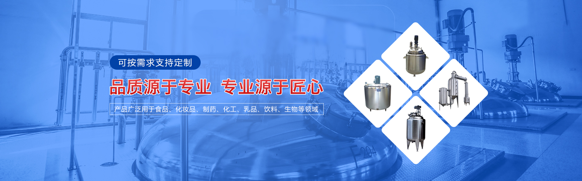 主要經營各種機械設備的制造、加工、銷售,主要產品有攪拌罐、冷熱缸、發酵缸、乳化罐、貯罐、移動罐、夾層鍋、調配罐、脫氣罐、方槽、電加熱調配罐等各種食品機械和制藥機械。產品廣泛被用于食品、化妝品、制藥、化工、乳品、飲料、生物等領域,深受新老客戶的信賴與好評。